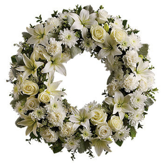 A ring of fragrant, bright white blossoms will create a serene display at any service. This classic wreath is a thoughtful expression of sympathy and admiration.